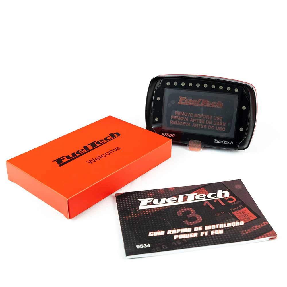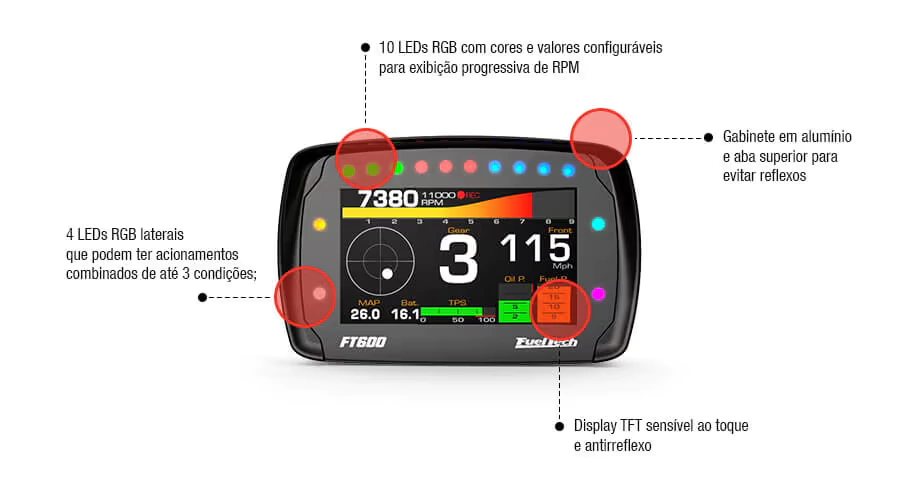A FuelTech FT600 é a perfeita união entre ECU e Painel de instrumentos, tornando-a o equipamento mais completo do mundo a possuir essas duas características integradas. Possui um novo e exclusivo gabinete de alumínio de altíssima qualidade à prova d’água (IP67). Seu design com aba superior que evita reflexos e abriga 10 LEDs com cor e intensidade configuráveis para utilização como SHIFT progressivo. Na lateral, conta ainda com mais 4 LEDs configuráveis como diagnóstico, alertas e estado de qualquer sensor. O produto conta com display TFT sensível ao toque e antirreflexo que incorpora um Painel de Instrumentos redesenhado e desenvolvido para tornar a visualização muito mais fácil ao piloto. A tela permite a edição dos mapas diretamente no módulo, sem necessidade do uso de computador.