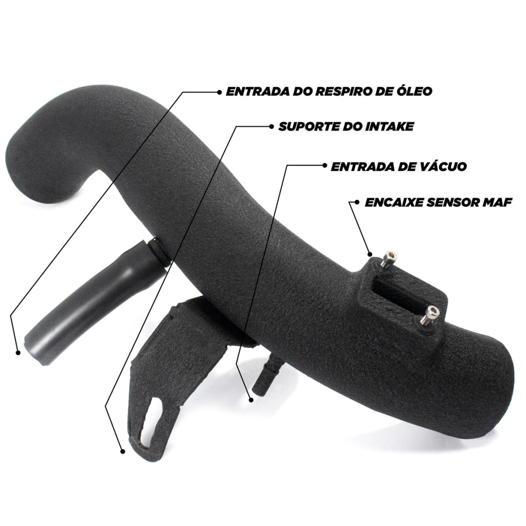 O tubo intake possui curvas lineares e com a parte interna lisa, aumentando assim a velocidade e pressão de ar até o turbo desde baixas até o pico de rotações do motor. Fabricados 100% em alumínio com parede de alta espessura para que desta forma o calor externo não atinja a parte interna do intake. Focando na temperatura mais fria possível, o acabamento é feito com pintura epóxi (eletrostática) em preto fosco texturizado que também possui o efeito de dissipar mais rápido a temperatura na admissão de ar para o motor.