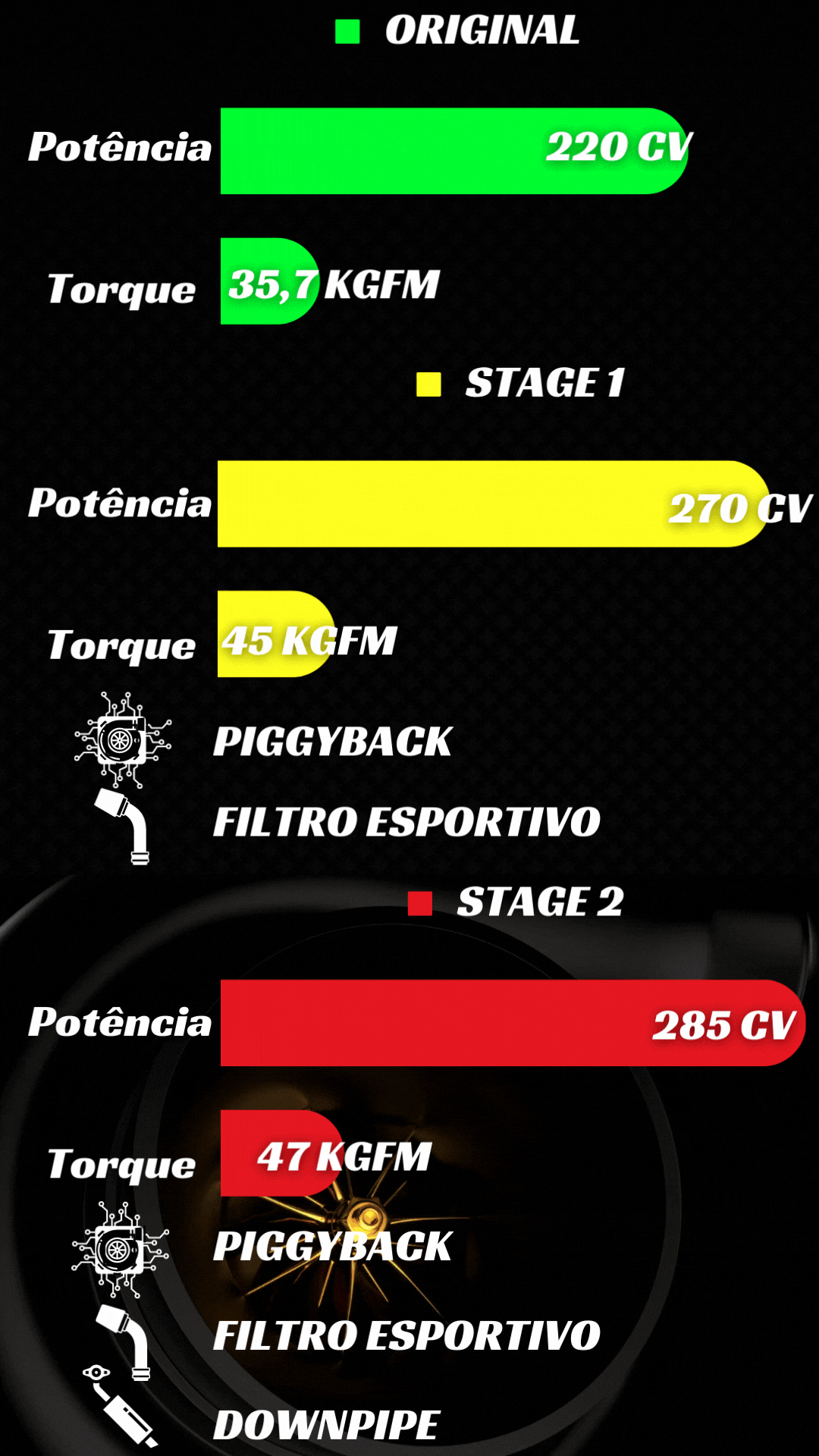 • 06 Mapas de Desempenho com ganho crescente de potência e torque;